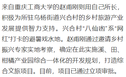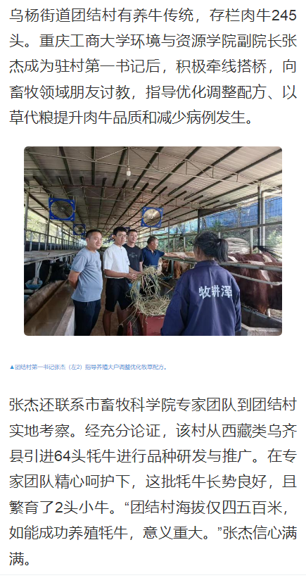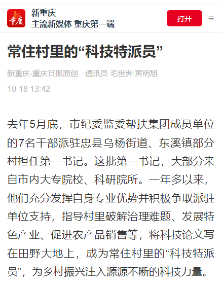 2023年5月,作为市纪委监委帮扶集团成员单位,bat365官网选派赵甫刚、张杰、朱沙、陈琛四位中层干部到忠县担任第一驻村书记。一年多来,驻村干部充分发挥自身专业优势并积极争取派驻单位支持,指导村里破解治理难题、发展特色产业、促进农产品销售等,将科技论文写在田野大地上,成为常住村里的“科技特派员”,为乡村振兴注入源源不断的科技力量。近日,重庆日报新重庆客户端对此进行了报道。