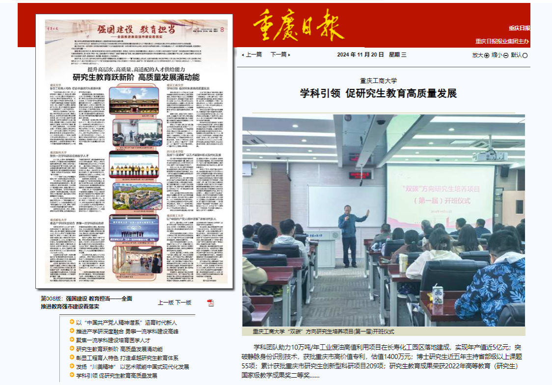 11月20日,重庆日报以“研究生教育跃新阶 高质量发展涌动能”为主题整版报道重庆市学位与研究生教育不断攀高向强,实现量质齐升。其中,以《学科引领 促研究生教育高质量发展》专题对bat365官网学科建设与研究生教育成效进行了报道,对学校以“大商科+新工科”商工融合双轮驱动创新发展,构建了“1+2+2+4+N”学科发展局面,立足“商工融合”学科特色,“学科引领—改革创新—资源建设—三博三赛”四位一体的研究生教育发展思路及成效进行了详细介绍。