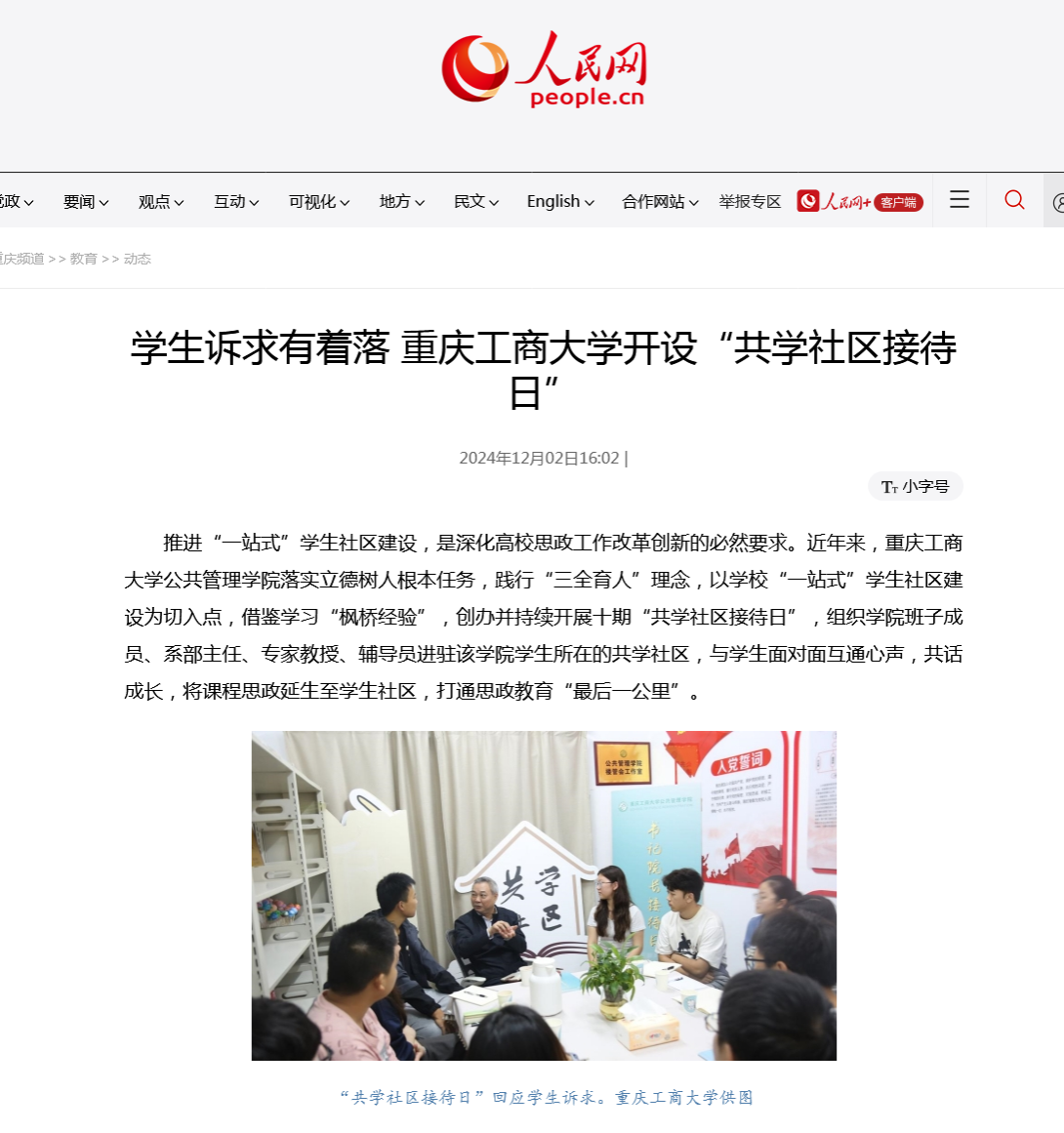 人民网以《学生诉求有着落 bat365中文官方网站开设“共学社区接待日”》为题进行了报道。