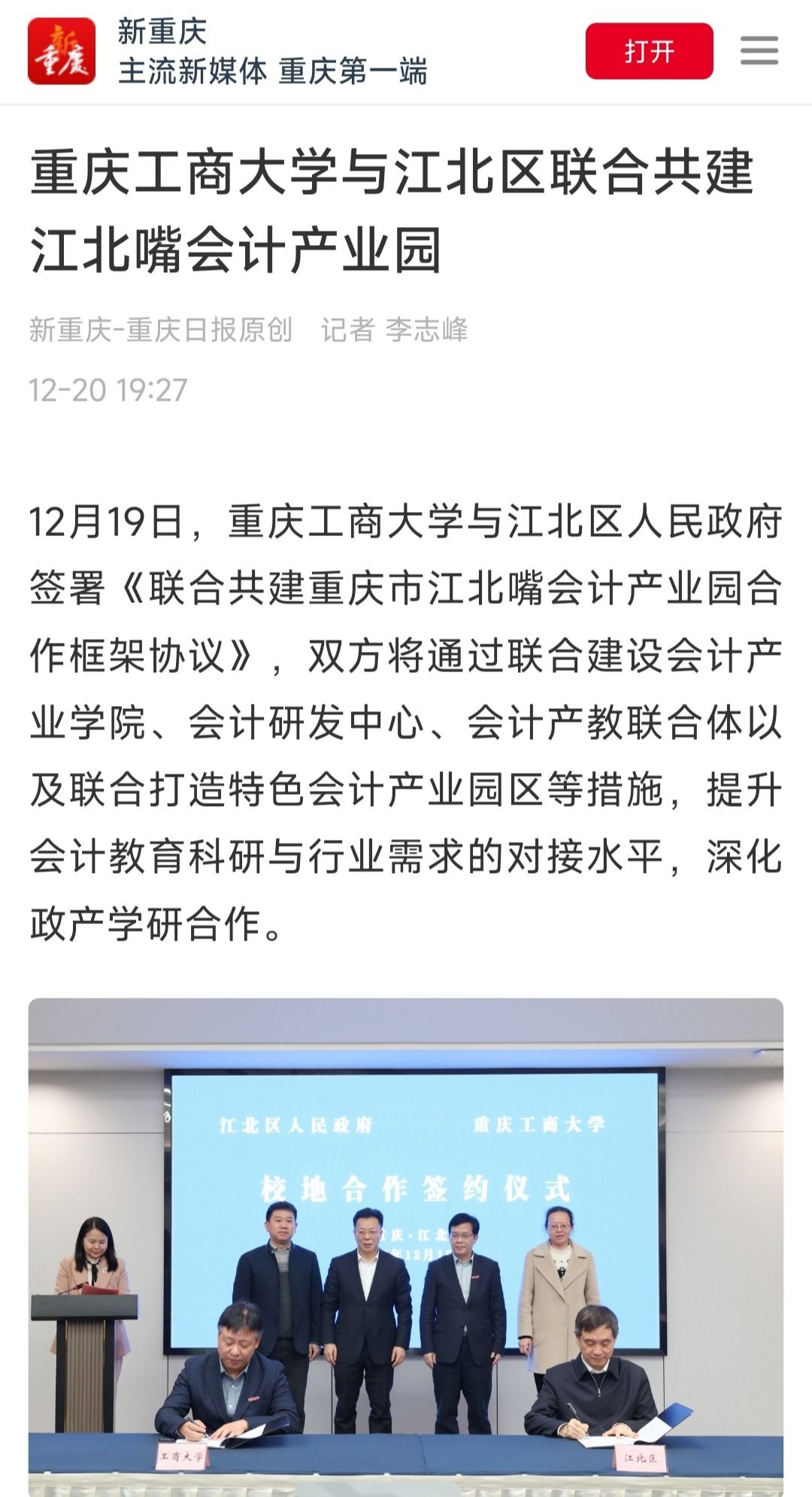 近日,bat365官网与江北区人民政府签署《联合共建重庆市江北嘴会计产业园合作框架协议》,双方将通过联合建设会计产业学院、会计研发中心、会计产教联合体以及联合打造特色会计产业园区等措施,提升会计教育科研与行业需求的对接水平,深化政产学研合作。