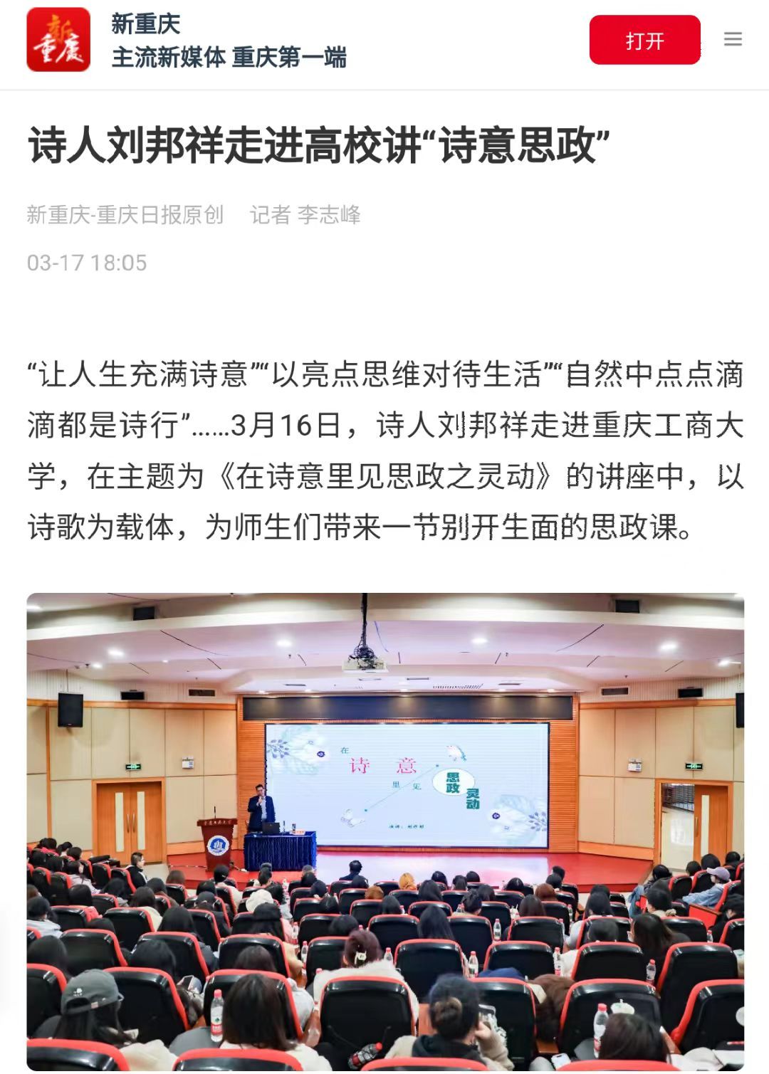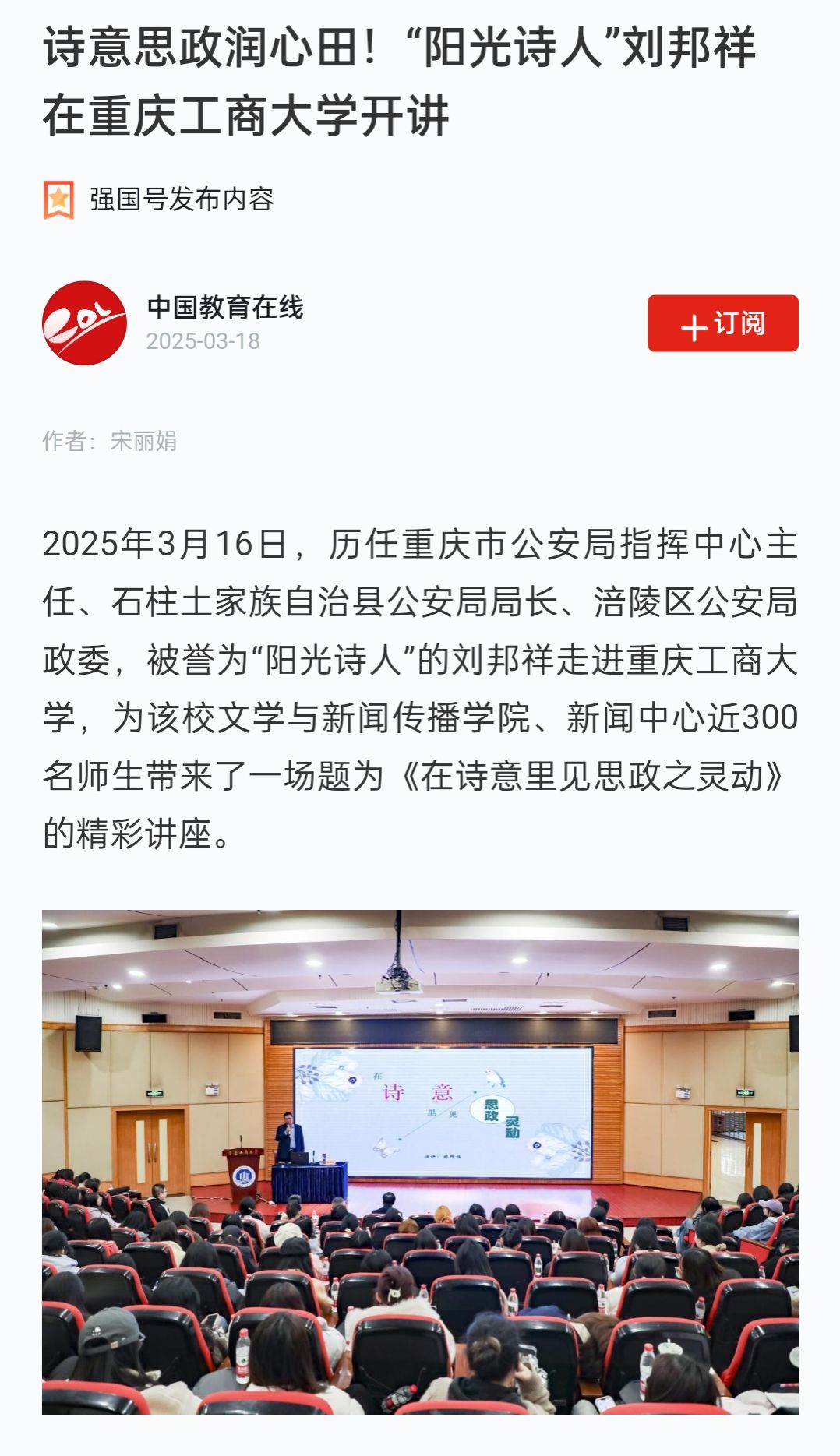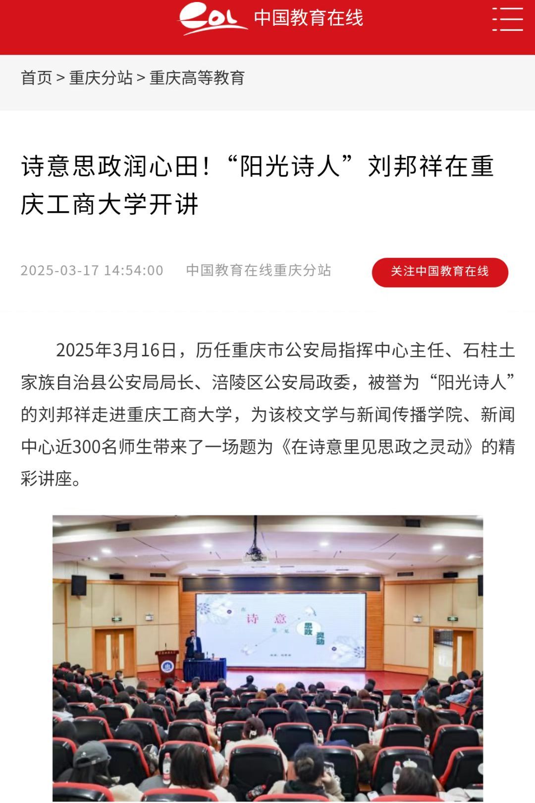 3月16日下午,“在诗意里见思政之灵动”主题讲座在bat365官网博智楼7200报告厅成功举办。本次讲座由学校党委宣传部、文学新闻学院共同主办,特邀历任重庆市公安局指挥中心主任、石柱县公安局局长、涪陵区公安局政委,重庆市公安局一级警务专员,被誉为“阳光诗人”的刘邦祥担任主讲人。新重庆-重庆日报客户端、学习强国和中国教育在线对此活动进行了报道。