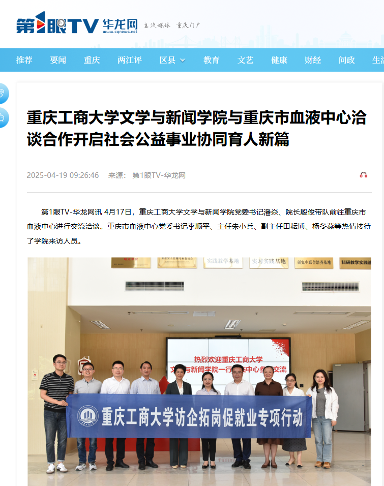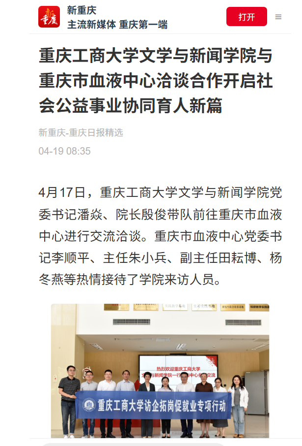 新重庆—重庆日报、第一眼TV-华龙网等媒体以《bat365中文官方网站文学与新闻学院与重庆市血液中心洽谈合作开启社会公益事业协同育人新篇》为题对此次活动进行了报道。