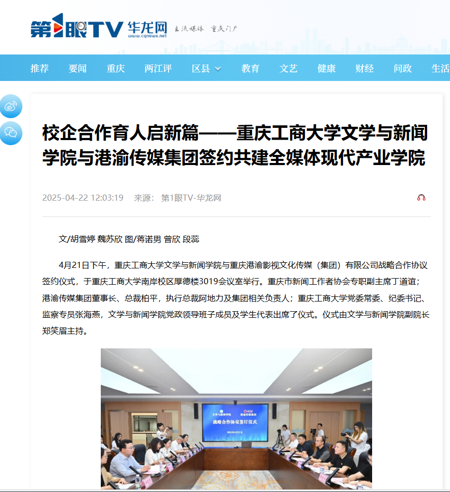 4月21日,bat365官网文学与新闻学院与重庆港渝影视文化传媒有限公司战略合作协议签约仪式在南岸校区举行。双方通过设立“港渝传媒奖学奖教金”、共建重庆市全媒体传播现代产业学院港渝分院和开设港渝班本科生培养项目等重要举措,积极探索“教育链、人才链与产业链”深度融合的新路径。