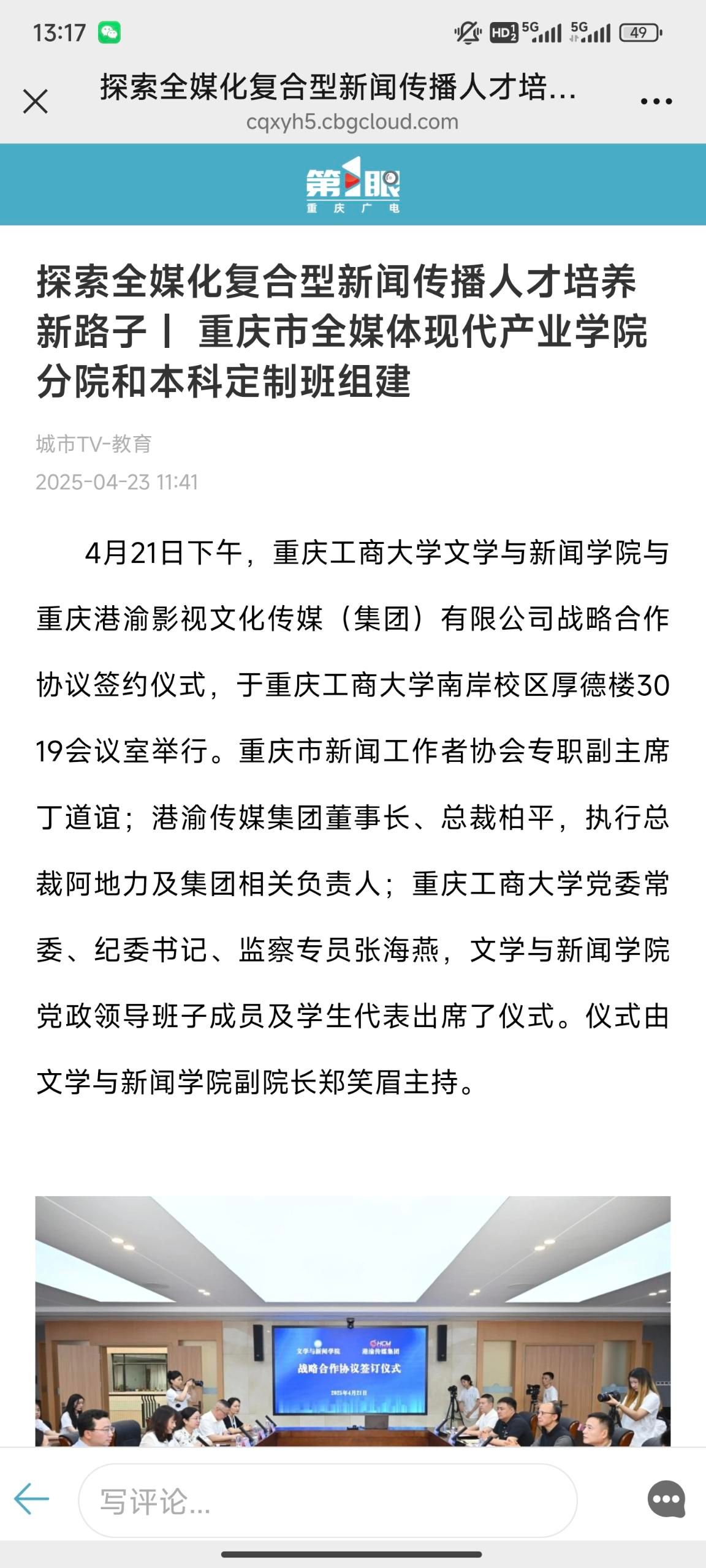 新重庆-重庆日报、第1眼TV-华龙网、重庆广电第一眼分别以《探索全媒化复合型新闻传播人才培养新路子 重庆市全媒体现代产业学院分院和本科定制班组建》对本次活动进行报道。
