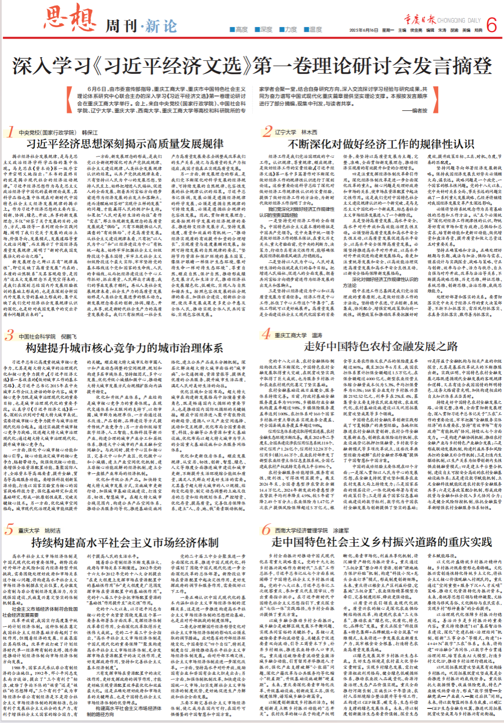 6月16日,《重庆日报》思想周刊第06版专版刊发深入学习《习近平经济文选》第一卷理论研讨会发言摘登。详见《重庆日报》2025年6月16日思想周刊。