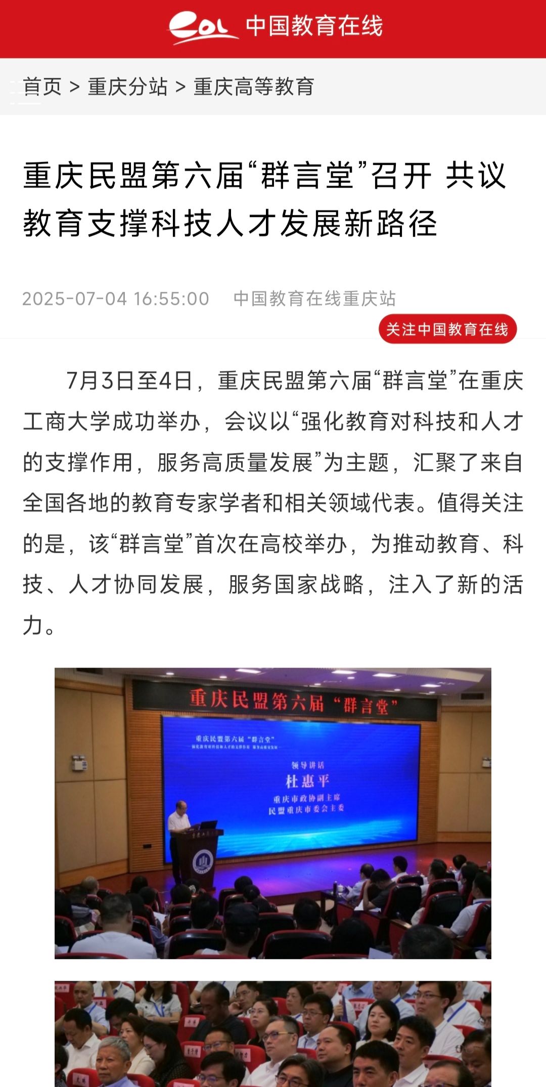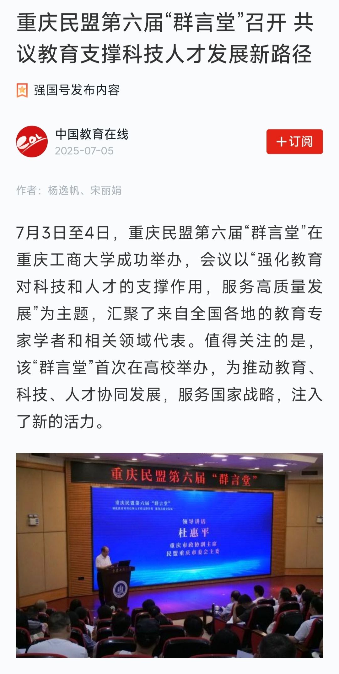 1.新重庆-重庆日报:聚焦教育对科技、人才的支撑作用 重庆民盟第六届“群言堂”共话高质量发展路径