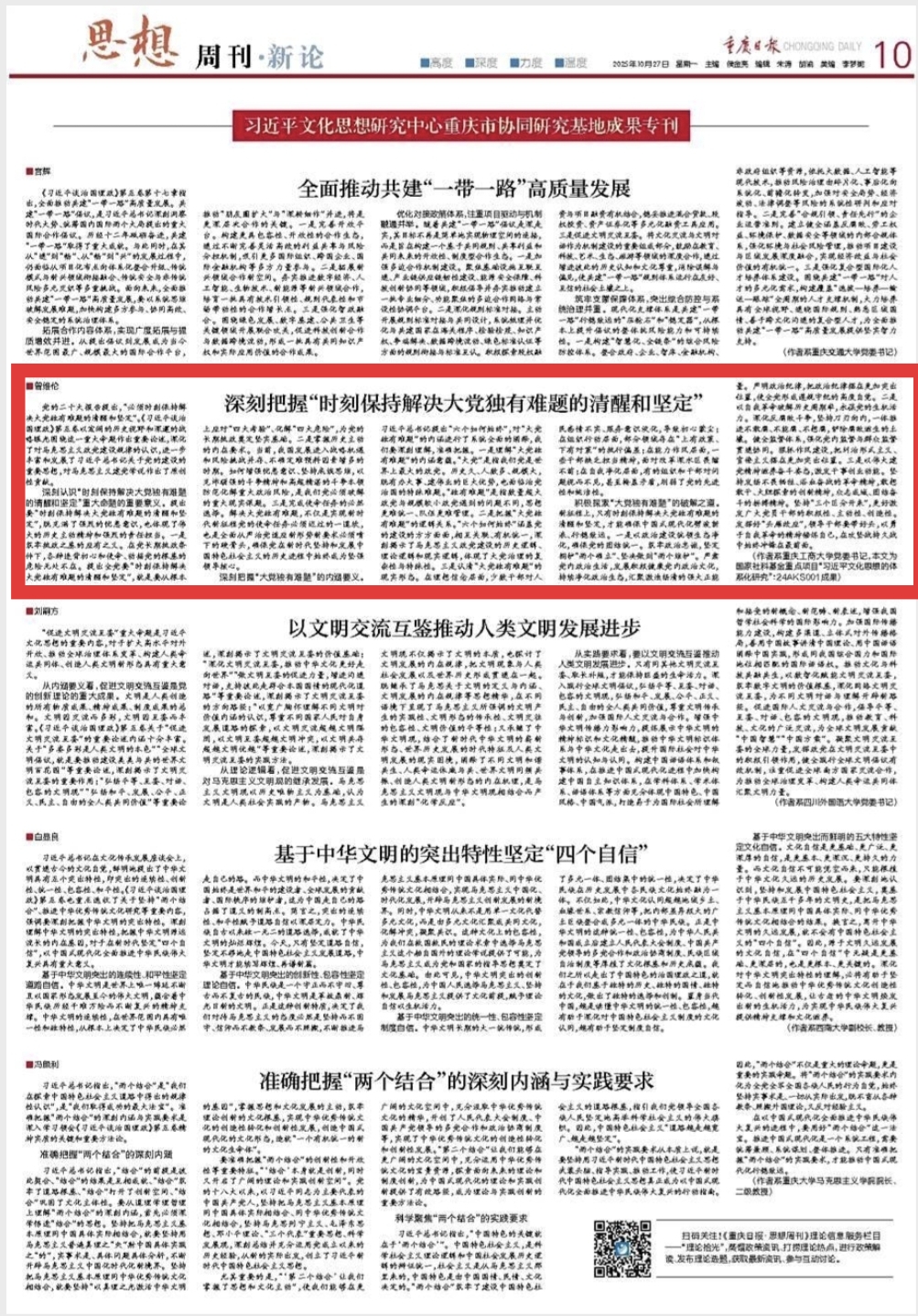 10月27日,《重庆日报》第10版思想周刊刊发学校党委书记曾维伦理论文章《深刻把握“时刻保持解决大党独有难题的清醒和坚定”》。文章强调要深刻认识“时刻保持解决大党独有难题的清醒和坚定”重大命题的重要意义,深刻把握“大党独有难题”的内涵要义,积极探索“大党独有难题”的破解之道。