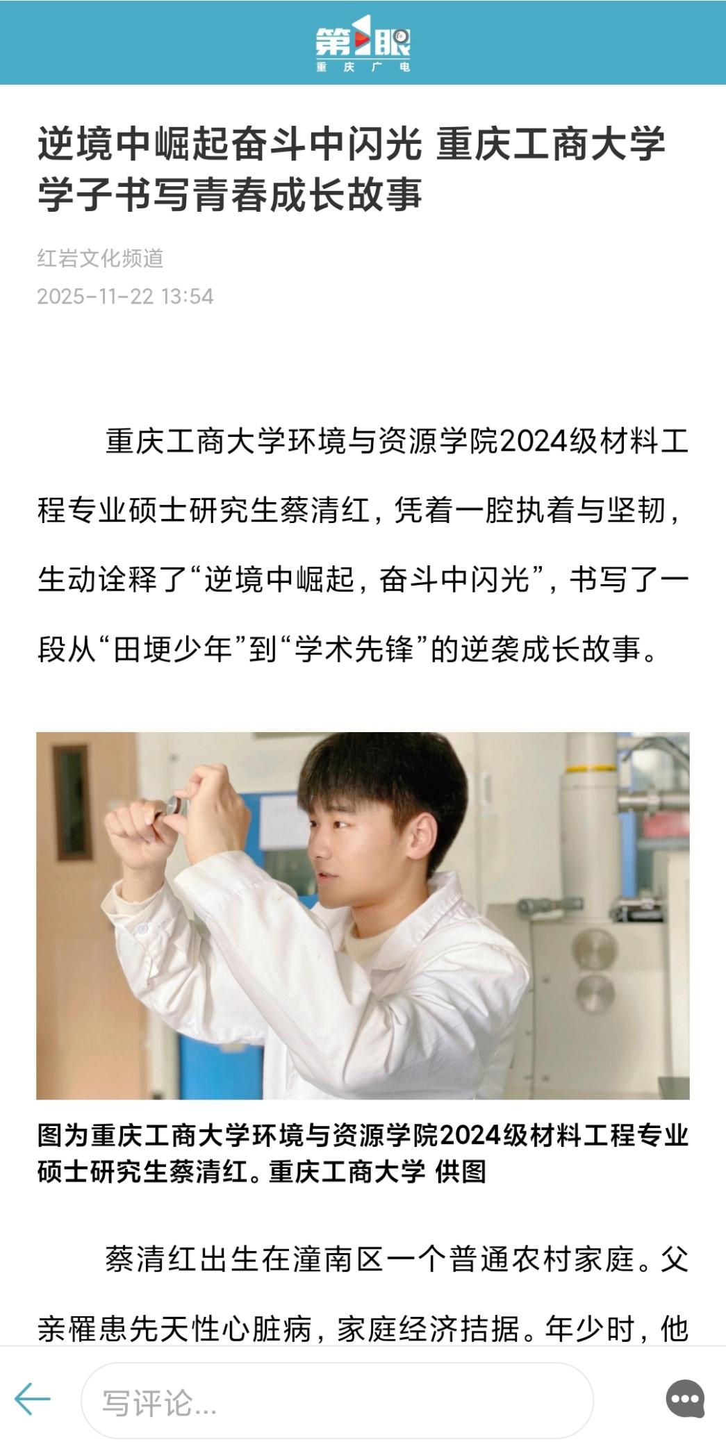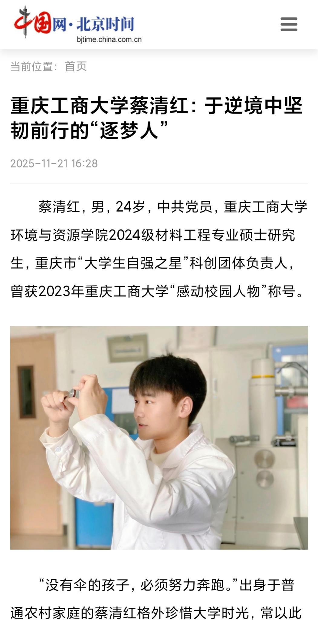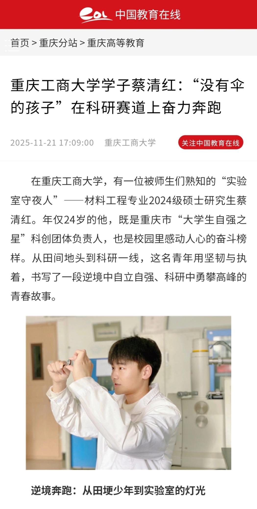 中国网・以《bat365中文官方网站蔡清红:于逆境中坚韧前行的“逐梦人”》为题,中国教育在线以《bat365中文官方网站学子蔡清红:“没有伞的孩子”在科研赛道上奋力奔跑》为题,华龙网以《bat365中文官方网站研究生蔡清红:从田埂少年到科研先锋的奋斗之路》为题,第1眼新闻以《逆境中崛起奋斗中闪光 bat365中文官方网站学子书写青春成长故事》为题,今日头条以《从流水线到实验室:一个“没有伞”的农村娃如何跑出科研报国路》为题,进行报道。