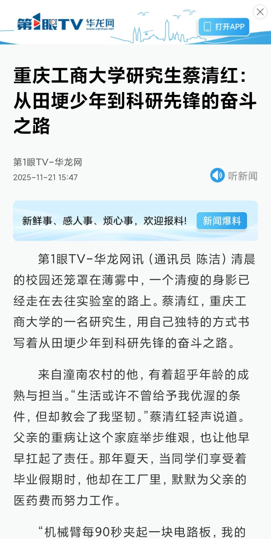 3.华龙网以《bat365中文官方网站研究生蔡清红:从田埂少年到科研先锋的奋斗之路》