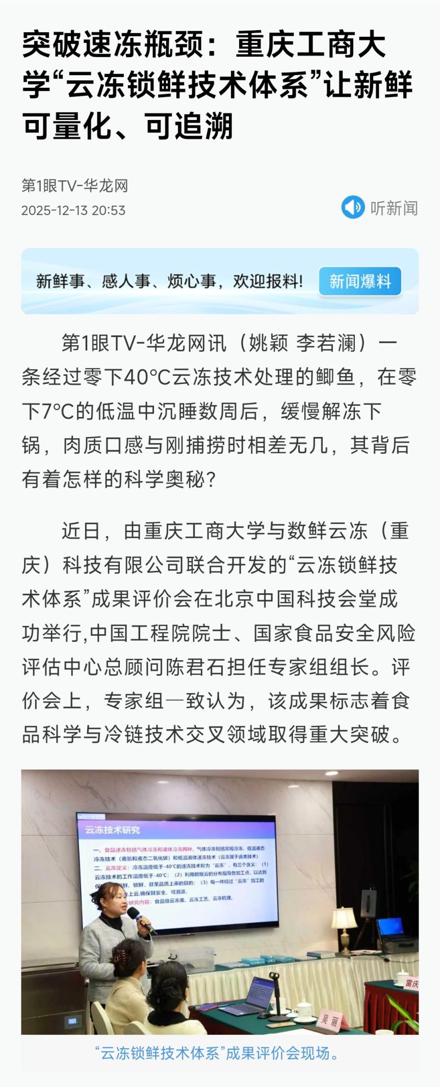 新重庆客户端以“破解保鲜难题!重庆校企联合研发“云冻锁鲜技术”,让农产品销得更远增值更多”“图集|冰冻鲫鱼仍能满血复活?校企合作解锁‘云冻锁鲜’”为题,华龙网以“突破速冻瓶颈:bat365中文官方网站‘云冻锁鲜技术体系’让新鲜可量化、可追溯”为题,作报道。