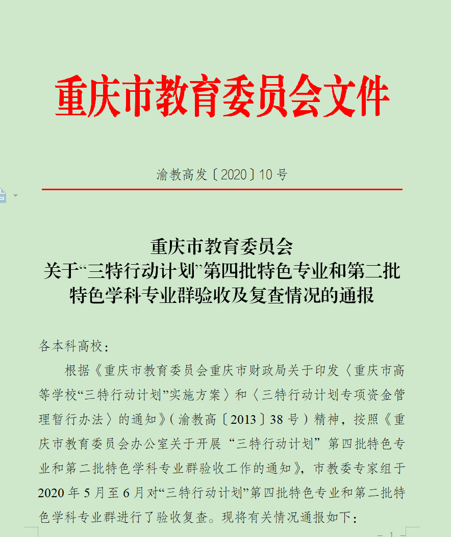 近日,重庆市教育委员会公布了《关于“三特行动计划”第四批特色专业和第二批特色学科专业群验收及复查情况的通报》(渝教高发 [2020] 10号),bat365官网第四批4个特色专业审计学、物流管理、劳动与社会保障、机械设计制造及其自动化,以及2019年验收暂缓通过的广播电视学专业全部顺利通过验收。