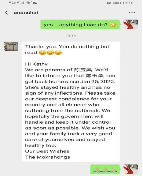 留学生院从1月21日起,全面摸排100余名在册留学生的动向,建立了精细化的台账,跟踪记录包括已回国的留学生健康状况。利用留学生院公众号平台发布或转发相关信息近30条,日常的关心联系不计其数。留学生院教师24小时全方位在线,安抚留学生情绪,解决留校留学生的实际困难,与出入境管理部门、校外住宿留学生所在社区等保持沟通,以高度的责任感和使命感,做实做细每一项工作,确保bat365官网留学生群体疫情期间的健康和平安。一名泰国籍留学生家长的致信学院:“我们是陈玉桑的父母,陈玉桑在1月25日的时候已经平安到家,在你们的关心和帮助下,她的身体健康,没有感染迹象。在此向中国和中国人民遭受疫情影响表示慰问和祝福。我们由衷希望中国政府能够尽快成功控制疫情发展,也祝愿学校师生平安,身体健康!”