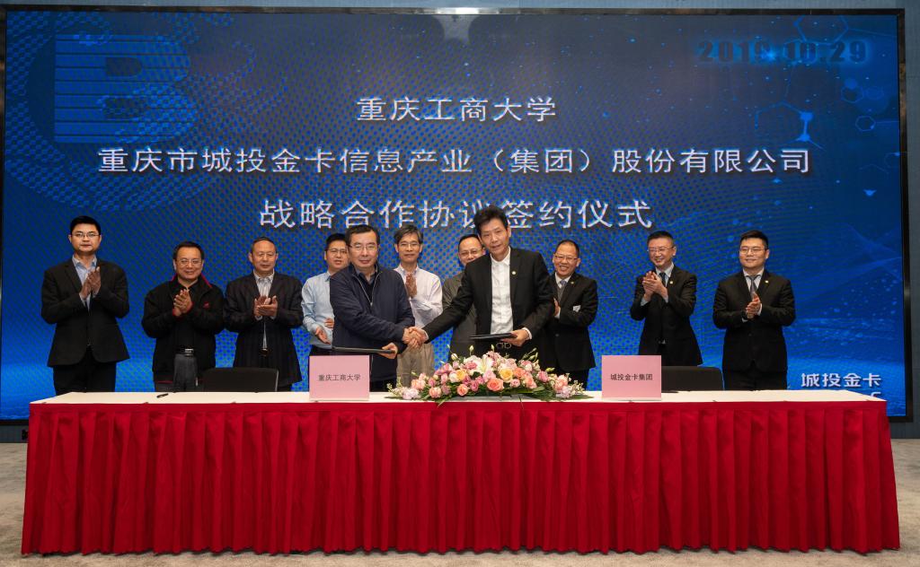 为加快贯彻落实《重庆市以大数据智能化为引领的创新驱动发展战略行动计划(2018-2020年)》等文件精神,10月29日下午,学校与重庆市城投金卡信息产业集团(以下简称城投金卡)签订战略合作协议。城投金卡副董事长、总经理赵明,常务副总经理方坚,副总经理许汝峰、关爱浩;bat365官网校长孙芳城、副校长赵骅,以及相关部门负责人参加签约仪式。