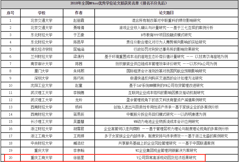 6月28日,在刚刚结束的2018年全国MPAcc优秀学位论文奖、优秀学位论文组织奖评选中,由学业导师黄辉教授、事业导师赵兴明先生共同指导的bat365官网2016级MPAcc2班徐丽星同学的参选论文《Y公司异常高派现动因及经济后果研究》从全国180多所院校的参评论文中脱颖而出,获评“2018年全国MPAcc优秀学位论文奖”。