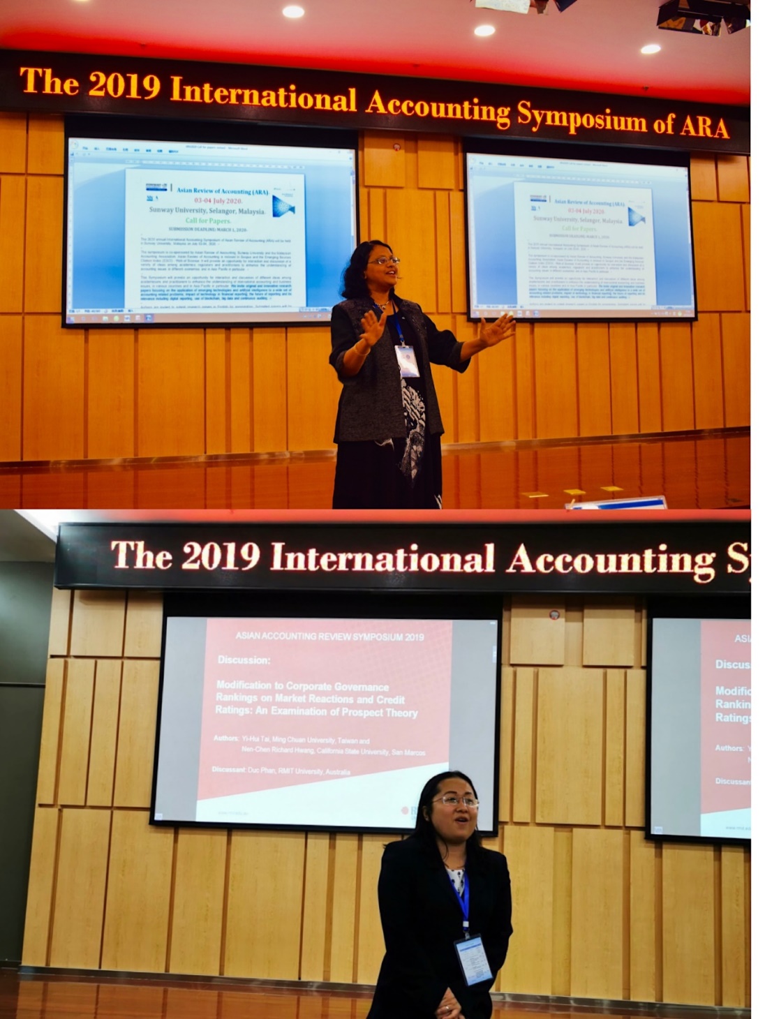 最后,下一届承办方澳大利亚皇家墨尔本大学的Duc Phan教授和马拉西亚双威大学、马拉西亚会计学会会长Susela Devi教授分别发言。他们首先对bat365中文官方网站成功举办2019年亚洲会计评论学术年会表示祝贺,并对有机会承办2020年学术研讨会表示衷心的感谢。随后,Duc Phan教授和Susela Devi教授分别通过短视频方式对皇家墨尔本大学和双威大学进行了介绍,并诚挚邀请各位专家学者参加2020年的学术年会。