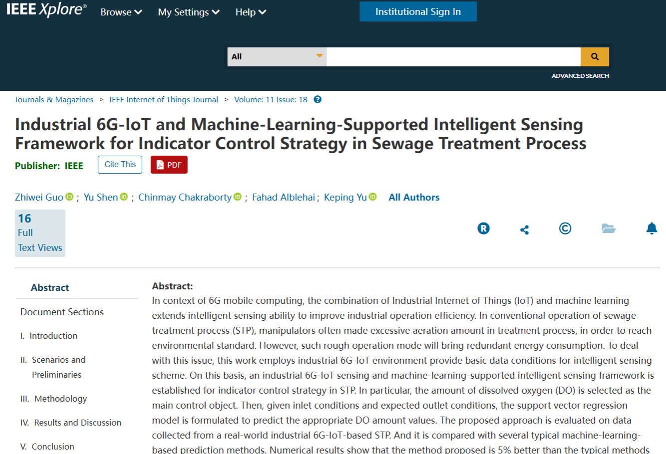 研究成果二:论文《面向污水处理指标控制策略的工业6G-物联网与机器学习支持的智能感知框架》