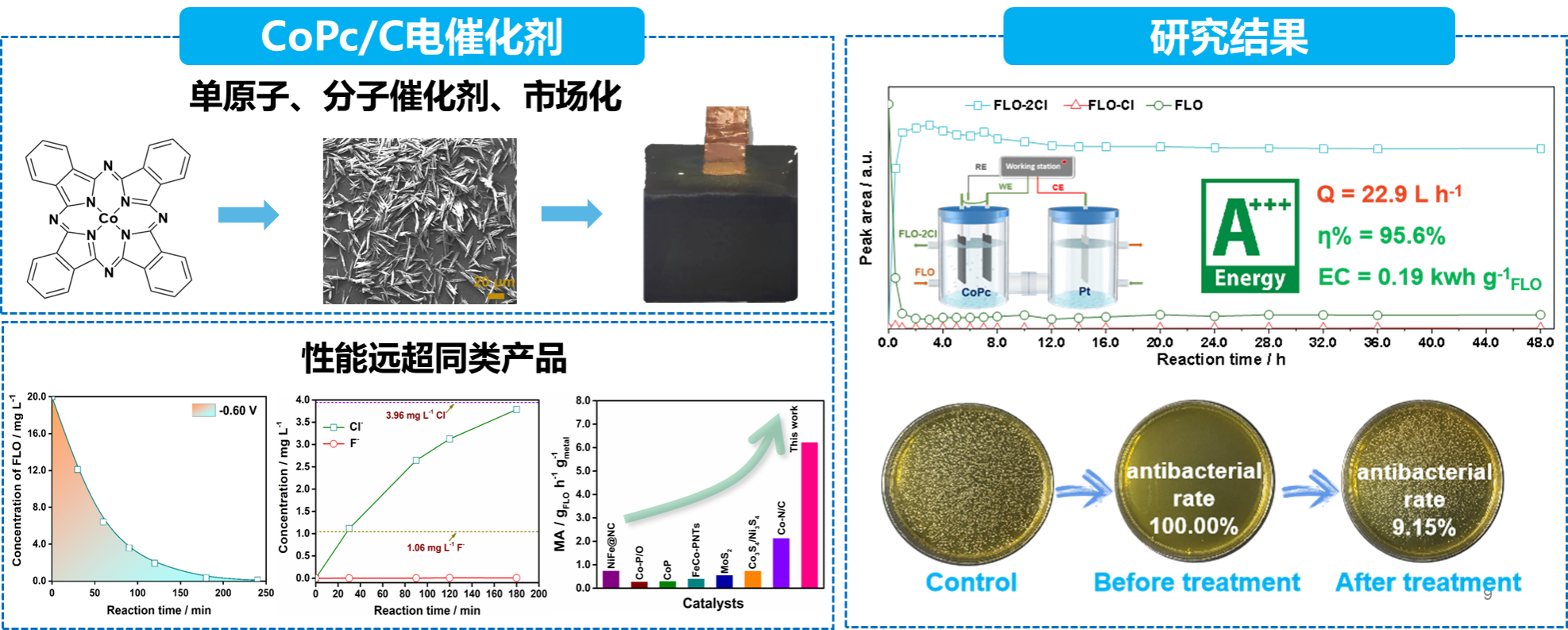 进展一:开发了基于酞菁钴的单原子分散催化剂,能在连续流运行下,实现接近100%的含氯持久性有机物脱除,降低90.85%的生物毒性。在理论研究方面,首次以分子轨道理论为指导,提出了决定酞菁钴催化剂脱氯能力的结构指示因子,明确了电子转移路径。该技术以商品化的金属有机分子为催化剂,解决了常规单原子催化剂合成成本高的问题;提出了高效催化剂的设计判据,为ARP技术的应用奠定了理论基础。相关成果发表于Chem. Eng. J. 2024, 499, 156276.