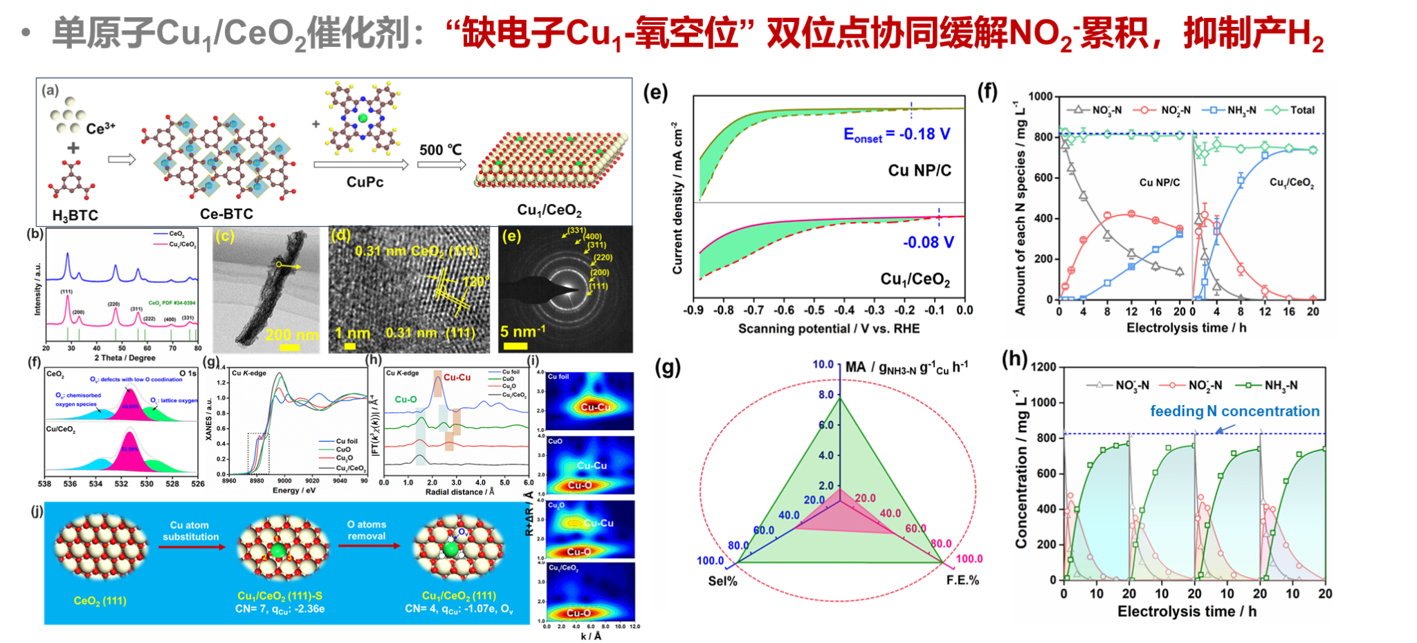 进展二:开发了一套包含“离子交换装置—树脂再生装置—电化学转化器—超声强化汽提装置”四个单元的一体化反应系统装备,可同时实现硝氮污染控制和氮资源循环利用的目标,可适用于缺乏电解质的自然水体或含结垢离子的工业污染水体修复。开发了铜基单原子催化剂(Cu1/CeO2),在原子水平上阐明了反应路径和决速步骤,提出了“缺电子Cu1-氧空位”双位点协同反应机制,解决了当前铜基催化剂反应速率慢,电流效率不高的问题。相关成果以封面论文形式发表于ACS ES&T Engineering 2024.