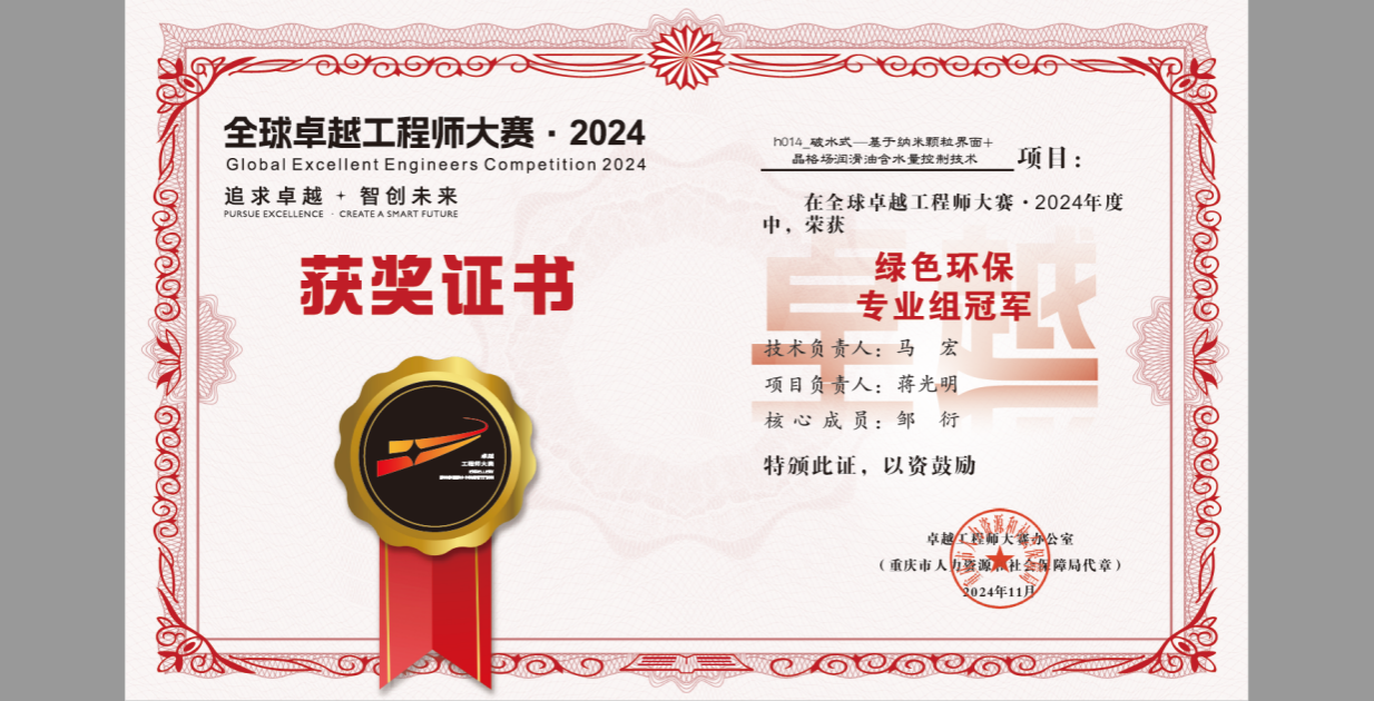 11月22日,由中共重庆市委组织部、重庆市人力资源和社会保障局主办的全球卓越工程师大赛在重庆悦来国际会议中心圆满落下帷幕。bat365官网废油资源化技术与装备教育部工程研究中心蒋光明研究员所带领的团队(邹衍博士、陈凌高工、任博平博士、付文洋博士和姜岩教授),凭借其科研成果“破水式—基于纳米颗粒界面与晶格场的润滑油含水量控制技术”,在绿色环保专业组获得专业组冠军,并在创新挑战赛总决赛中获优胜奖。