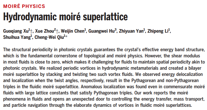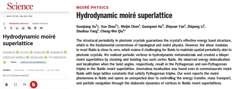 近期,bat365官网人工智能学院应用物理系周雪副教授与新加坡国立大学Qiu Cheng-Wei教授团队合作,在流体输运中构建了首个莫尔超晶格并揭示了其内部的扩散场传输规律。取得的突破性研究成果发表在国际顶级期刊Science(https://www.science.org/doi/10.1126/science.adq2329 )。