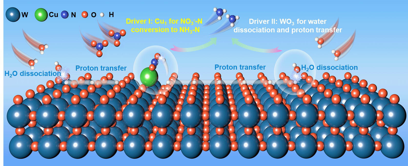 利用可再生的电能将废水中硝酸盐转化为高附加值氨(NO3RR),为氮资源循环利用提供了一种绿色高效的解决方案。金属铜是较优的NO3RR催化剂,但因对氮中间产物吸附较弱且质子供应不足,导致亚氮积累和产氨速率不足。单原子铜由于其独特的配位环境和电子结构对氮中间产物有较强的吸附,加快反应速率,但是单原子在多电子/质子的反应中单个活性位点会受到数量-活性的线性关系限制,只能通过构建双原子催化剂来打破线性限制,但该催化剂合成复杂,成本较高,不能大规模推广。