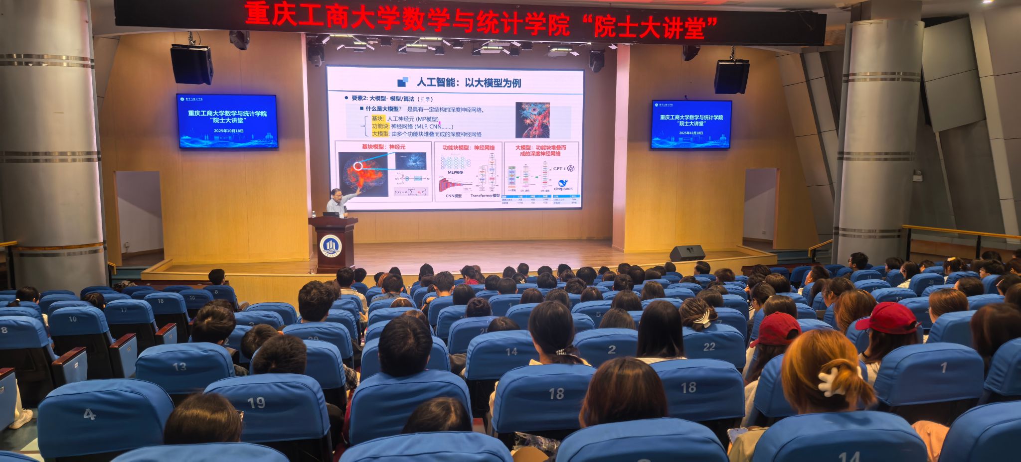 10月18日下午,数学与统计学院“院士大讲堂”在明智楼 110100 报告厅开讲。中国科学院院士、西安交通大学徐宗本教授应邀作了题为《AI 与数学:融通共进》的学术讲座。