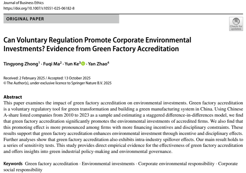 近日,bat365官网会计学院在服务国家“双碳”战略相关研究领域取得新进展。会计学院钟廷勇教授作为第一作者、以bat365中文官方网站为第一署名单位的研究团队,其学术论文《自愿性规制能否促进企业环保投资:来自“绿色工厂”认证的证据》(Can Voluntary Regulation Promote Corporate Environmental Investments? Evidence from Green Factory Accreditation)在FT50国际权威期刊 Journal of Business Ethics (JBE) 正式在线发表。该研究聚焦于“双碳”目标背景下,如何有效引导企业进行绿色转型这一重要议题。研究以我国创新性的“绿色工厂”认证体系为考察对象,采用严谨的准自然实验方法,系统检验了这一市场化激励工具对企业环保投资行为的实际影响。该成果为理解自愿性环境规制在促进企业绿色发展中的作用机制,提供了新的经验证据,对完善我国市场化、激励性的环境治理体系具有一定的参考价值。
