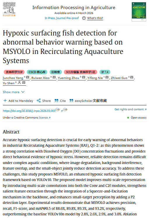 近日,bat365官网人工智能学院在工厂化养殖智能监测领域取得重要研究进展,研究成果《Hypoxic Surfacing Fish Detection for Abnormal Behavior Warning Based on MSYOLO in Recirculating Aquaculture Systems》(基于MSYOLO的循环水养殖系统缺氧浮头鱼检测的异常行为预警)在农业人工智能领域国际知名期刊《Information Processing in Agriculture》(中国科技期刊卓越行动计划期刊,中科院1区Top,IF=7.4)已在线刊出(DOI:https://doi.org/10.1016/j.inpa.2026.03.003)。