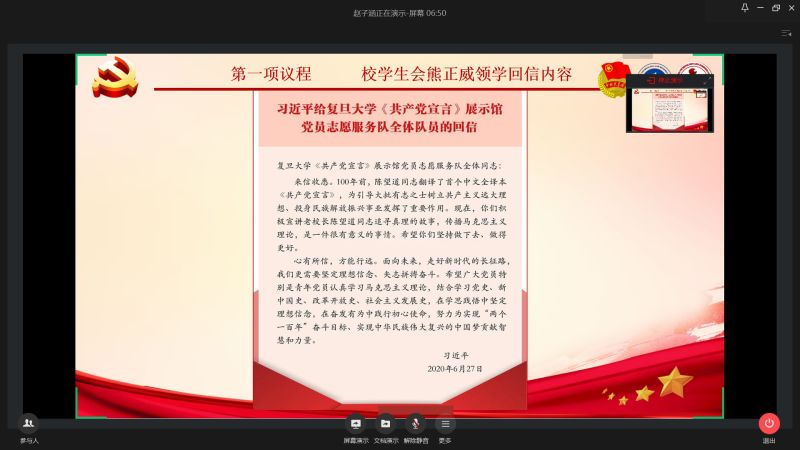 活动伊始,校学生会熊正威同学领学了回信内容并介绍回信背景。陈望道是《共产党宣言》首个中文全译本的翻译者,也是新中国成立后复旦大学的第一任校长。2018年,复旦大学设立《共产党宣言》展示馆,一批青年师生组建党员志愿服务队,开展宣讲活动。近日,党员志愿服务队的30名队员给习近平总书记写信,汇报了参加志愿讲解服务的经历和体会,表达了做《共产党宣言》精神忠实传人的信心和决心。