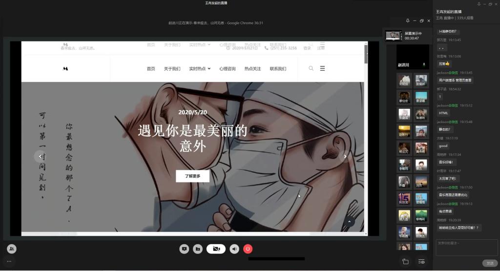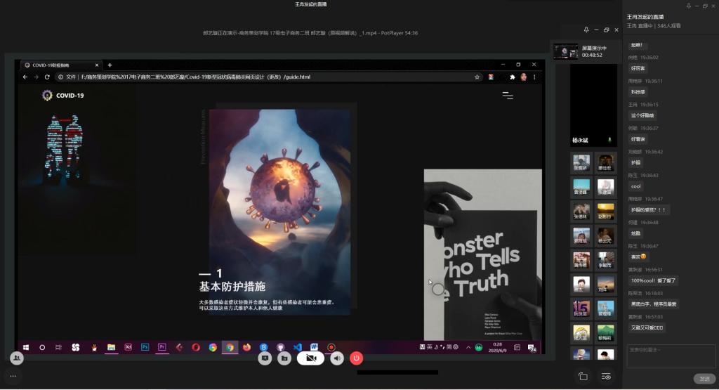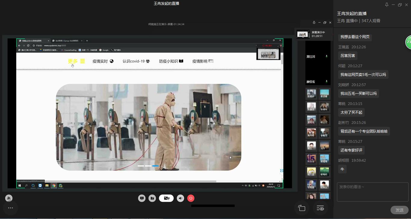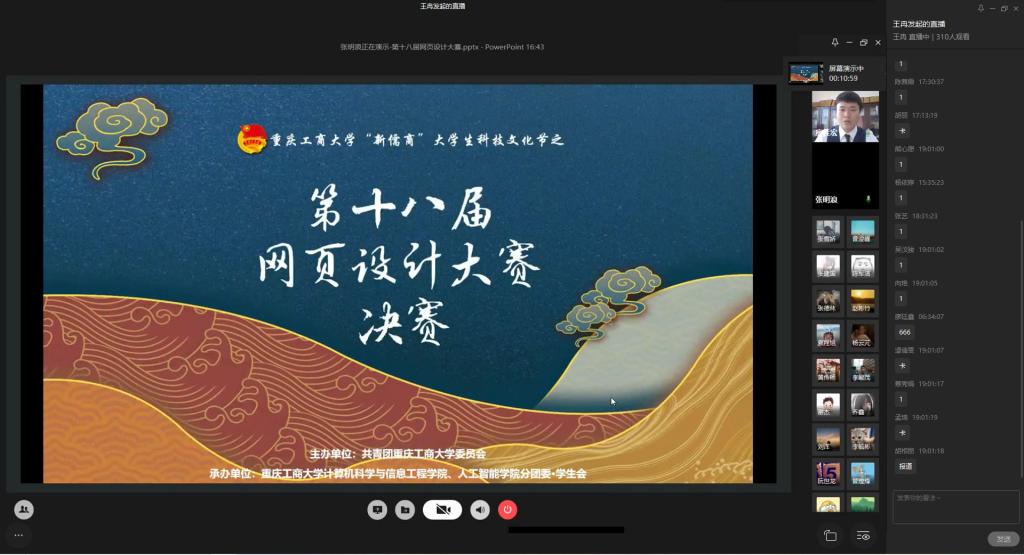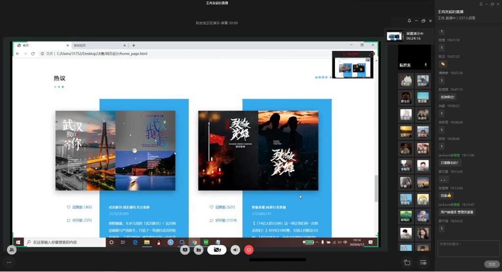 为弘扬伟大民族精神,厚植家国情怀,凝聚众志成城共抗疫情的强大力量,引导学生结合专业知识积极思考、实践,为抗疫贡献自己的智慧和力量,由校团委主办,计算机科学与信息工程学院、人工智能学院承办的“新儒商”大学生科技文化节之“共抗疫情,爱国力行”主题网页设计大赛决赛于6月12日晚上7点在企业微信直播间顺利举行。计信学院杨永斌副教授,杨艺副教授,唐灿副教授,赖涵博士应邀担任决赛评委。大赛邀请了校团委陆嘉副书记、计信学院党委陈亚惠副书记、校团委徐阔老师,计信学院学工办副主任向巧老师观摩指导比赛。决赛受到了各学院学生广泛关注,吸引了超过800人次的观看。