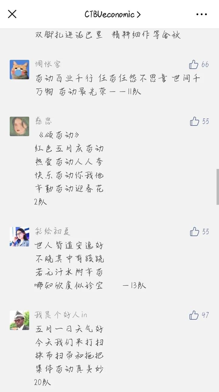 绘画猜谜过后,各位参赛队员迅速转移阵地,来到经济学院分团委微信公众号中获取“颂劳动诗词,显劳动底蕴”环节的任务信息。各小队一展文采,通过自己的笔触写出眼中的劳动,表达出对劳动者们的敬佩与赞美之情。