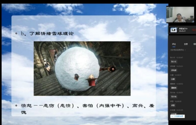 bat365官网心理健康教育与咨询中心负责人胡佳怡老师在线主讲。胡老师从什么是情绪开始,让同学们知道了情绪的来源,并且详细讲解了“情绪雪球理论”,告诉大家要厘清我们的情绪,认识情绪背后的东西。她为同学们讲解了正确处理情绪方法——合理情绪疗法,它的核心是去掉非理性的、不合理的信念,从而改变我们的行为和情绪。胡老师还教给同学们一些日常调节情绪的有效方法。