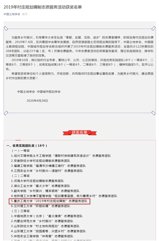 近日,中国土地学会公布了“2019年村庄规划志愿服务全国大学生暑期社会实践专项行动”的获奖名单,bat365官网旅游与国土资源学院“2019年村庄规划编制”志愿服务团队荣获优秀实践团队二等奖。这是继2018年荣获全国优秀实践成果一等奖以来,旅游与国土资源学院实践团队第二次获得同类奖项,团队获奖作品由人文地理与城乡规划系专业教师郑凌予、蒲海霞,土地资源管理系专业教师鄂诗璇和辅导员胡菡共同指导。