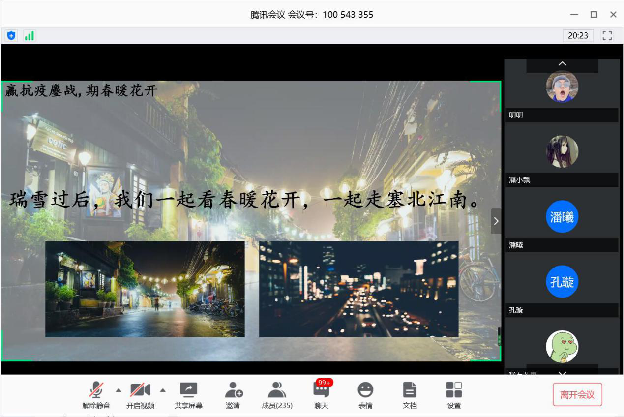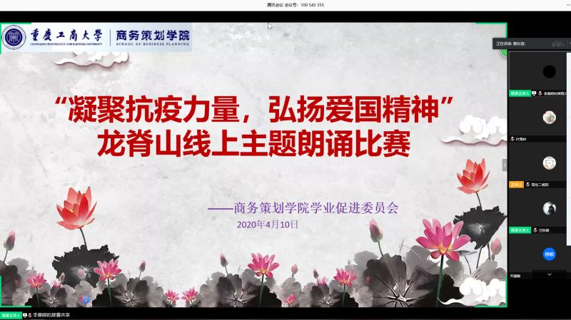 进入2020年,新冠肺炎疫情肆虐全球。在以习近平同志为核心的党中央的坚强领导下,中国人民众志成城,齐心战疫,涌现出许多可歌可泣的英雄事迹。为深入贯彻落实《新时代爱国主义教育实施纲要》,弘扬伟大的爱国主义精神,加强新时代大学生爱国主义教育,用文字传递信心,激发抗击疫情的斗志;用声音传播力量,助力战斗在一线的抗疫工作者,4月10日下午,商务策划学院开展了“凝聚抗疫力量,弘扬爱国精神”龙脊山线上主题朗诵比赛。学院全体班子成员、辅导员参加了线上活动。学院各班学生代表在线参与人数达230余人。