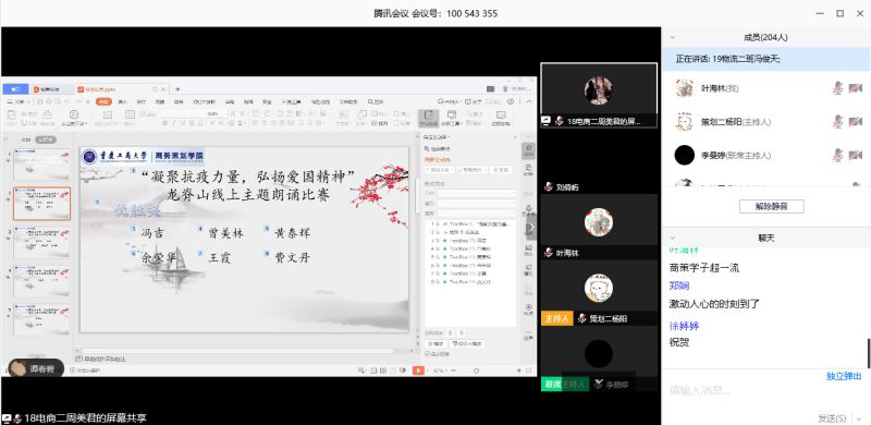 商策学院学子积极观摩和聆听选手精彩表现,比赛期间,在线观众人数高达230多人,学子们纷纷赞叹选手们的精彩朗诵、精美的PPT展现和视频演绎,在比赛平台讨论房间里,为国家、为选手加油喝彩的声音和比赛交流,没有停歇,氛围非常热烈。