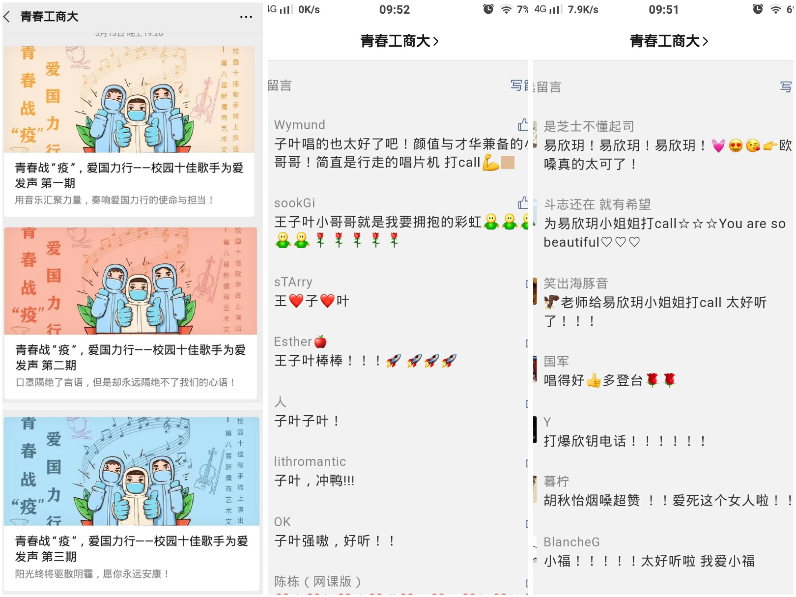 本次十佳歌手线上活动获得bat365官网同学们的广泛好评,同学们在微信留言处积极互动,让本次“为爱发声”线上活动的主题更加的明确。