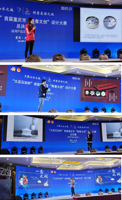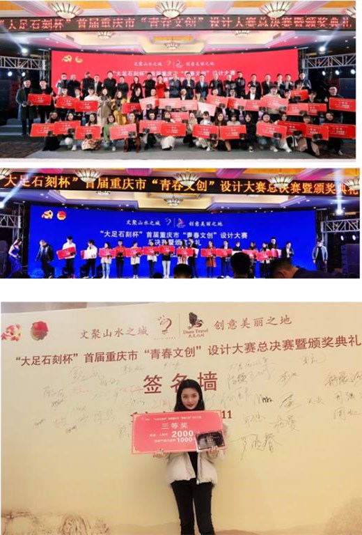 由中共重庆市委宣传部、重庆市文化和旅游发展委员会、共青团重庆市委员会、重庆市大足区人民政府主办的“大足石刻杯”青年文化创意作品设计大赛总决赛于2019年11月21日在重庆大足成功落幕。艺术学院汪维丁、周亚林老师指导的17视传专业学生郭入菁设计作品《大足风韵》荣获总决赛三等奖;黄海燕老师指导的17产品设计专业生子仪、唐俊辉、李妞妞、王佳佳、张一凡设计作品《兜转-莲花拇指陀螺》、许灵蕊《六道轮回盘指南针》、傅雯倩、龚家颖设计作品《茶香盖碗》获得优秀奖;李洋老师指导的杨尧洁、王钱盈盈、梁紫琪设计作品《大足石刻游览图鉴》获得优秀奖。