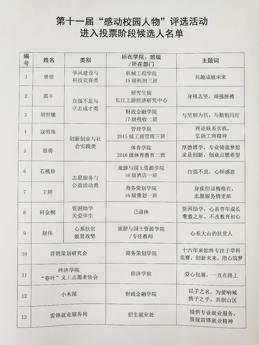 由党委宣传部、校团委主办,商务策划学院承办的2019年第十一届“感动校园人物”评选活动至2月底启动以来,得到了全校各部门及广大师生的密切关注和积极参与。主委会共收到来自全校各学院、各部门推荐的个人14名,团队8个。