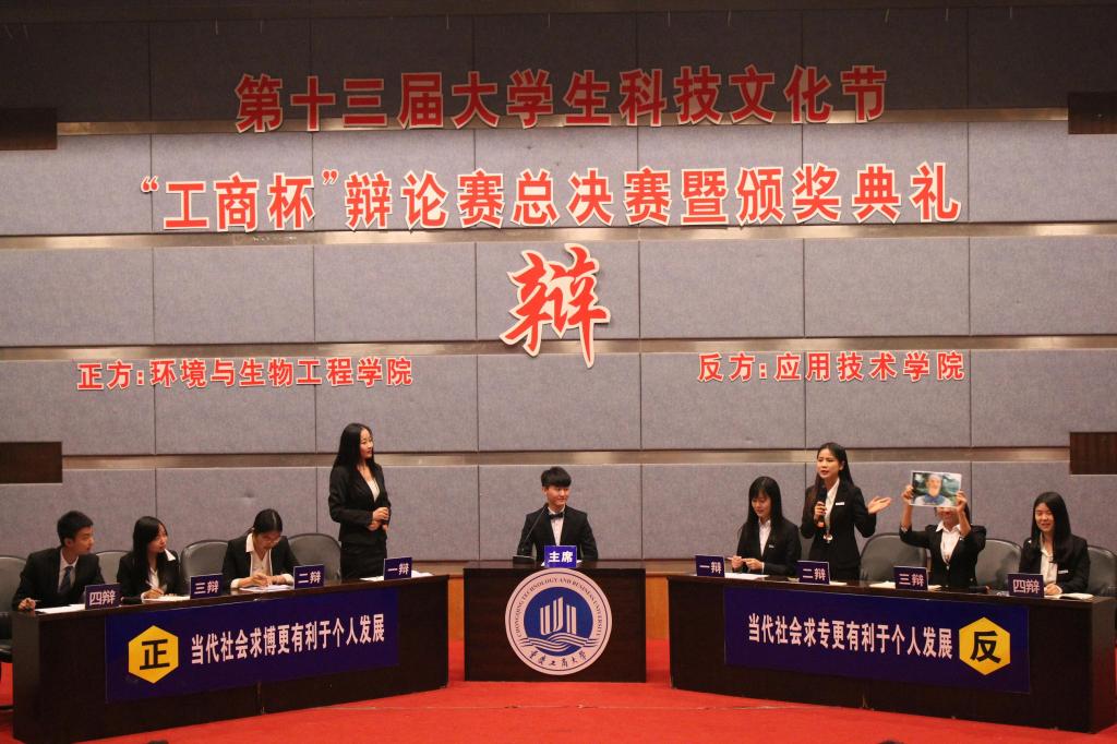 4月10日下午,由校团委主办的bat365官网第十三届大学生科技文化节之“工商杯”辩论赛总决赛在博智楼7100报告厅举行。本届“工商杯”辩论赛历时半载,经过40余场比赛的激烈角逐,共有17名学生评委、13名老师评委参与评选,从19支学院代表队中脱颖而出的环境与生物工程学院代表队、应用技术学院代表队迎来了最后的巅峰对决。校团委杨娟副书记,部分学院党总支书记、副书记,来自全校各学院的500余名师生观看了比赛。