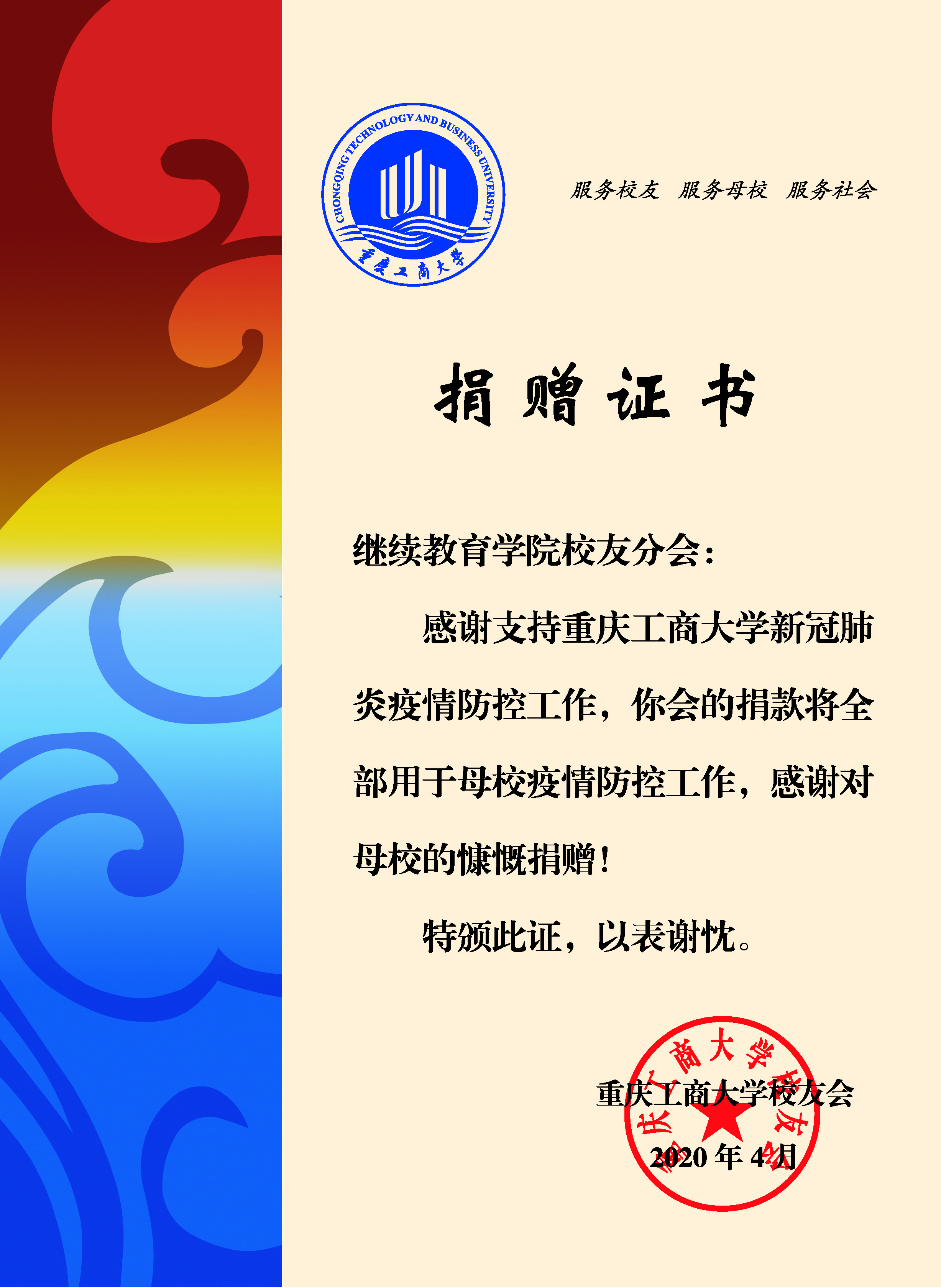 自疫情爆发以来,继续教育校友主动与学校联系,在了解母校疫情抗击情况后,分会秘书处发出捐款倡议, 齐心与母校并肩战斗。继续教育学院广大校友第一时间积极响应,纷纷自愿捐款,筹集到8346.80元善款,定向用于bat365官网抗疫工作。继续教育学院校友分会会长杜伟说:“重工商大永远是我们的家。聚沙成塔,滴水泉涌,希望大家都能为母校的疫情防控尽一份绵薄之力。”