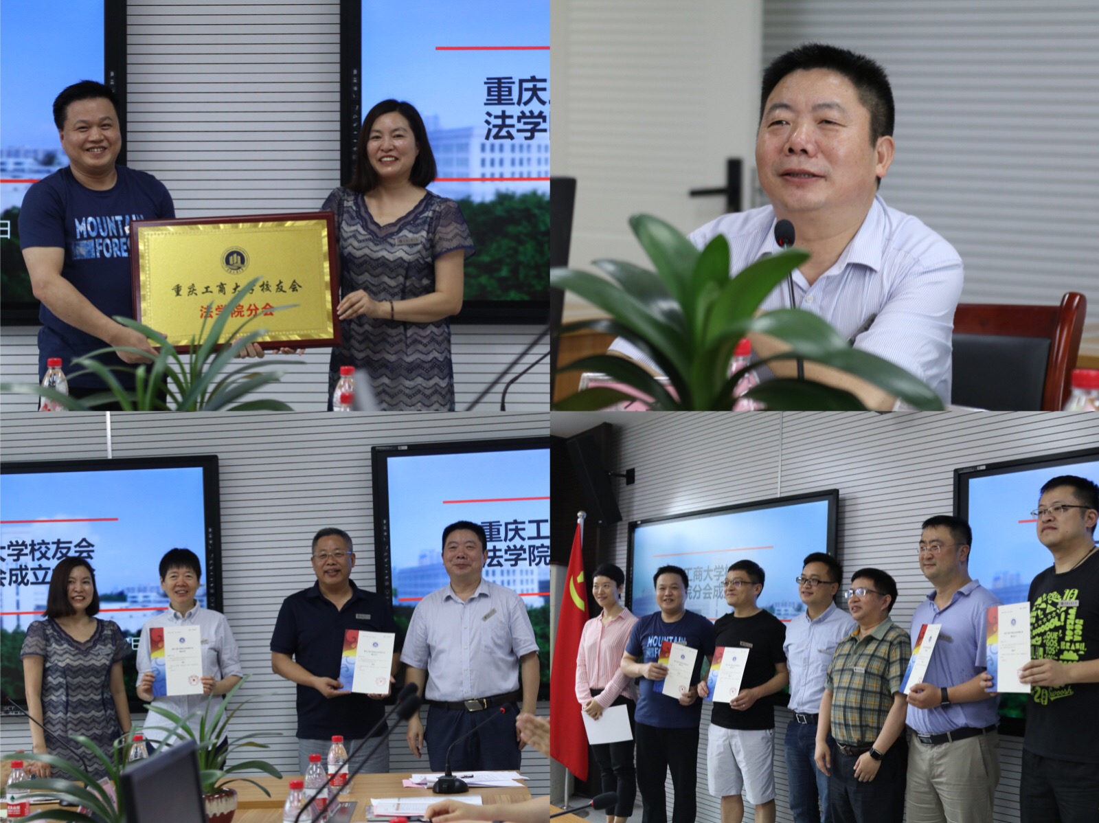 会上,2001级校友范志军代表法学院分会筹备工作组做《bat365中文官方网站校友会法学院分会筹备工作报告》,他说学院从2015年以来多次到广东、海南等地,与校友们一起筹划校友分会成立工作,广大校友关心母校发展,热心校友工作,去年法学2006级校友戴学良等12位校友代表回校召开了学院校友分会筹备工作第一次会议。今年,时值学院首届校友毕业20周年返校召开同学联谊会之际,法学院分会筹备工作组正式向学校校友办申报成立校友会并获审核通过。学院副院长刘勇宣读了bat365中文官方网站校友会《关于同意成立bat365中文官方网站校友会法学院分会的批复》。会议审议并通过了《bat365中文官方网站校友会法学院分会章程》、《法学院校友分会第一届理事会顾问、副会长、秘书长、副秘书长建议名单》。法学院党总支书记李自维教授为“bat365中文官方网站校友会法学院分会”授牌,并与学院党政领导、黄文教授一起为新当选的法学院分会第一届理事会顾问、副会长、秘书长、副秘书长颁发聘书。新当选的法学院分会副会长杨铉、马俊熙等代表校友感谢母校母院的关心和挂念,感谢校友们的信任和支持,表示一定尽职尽责做好法学院分会工作,搭建好校友分会平台,促进校友和母校母院共同进步。