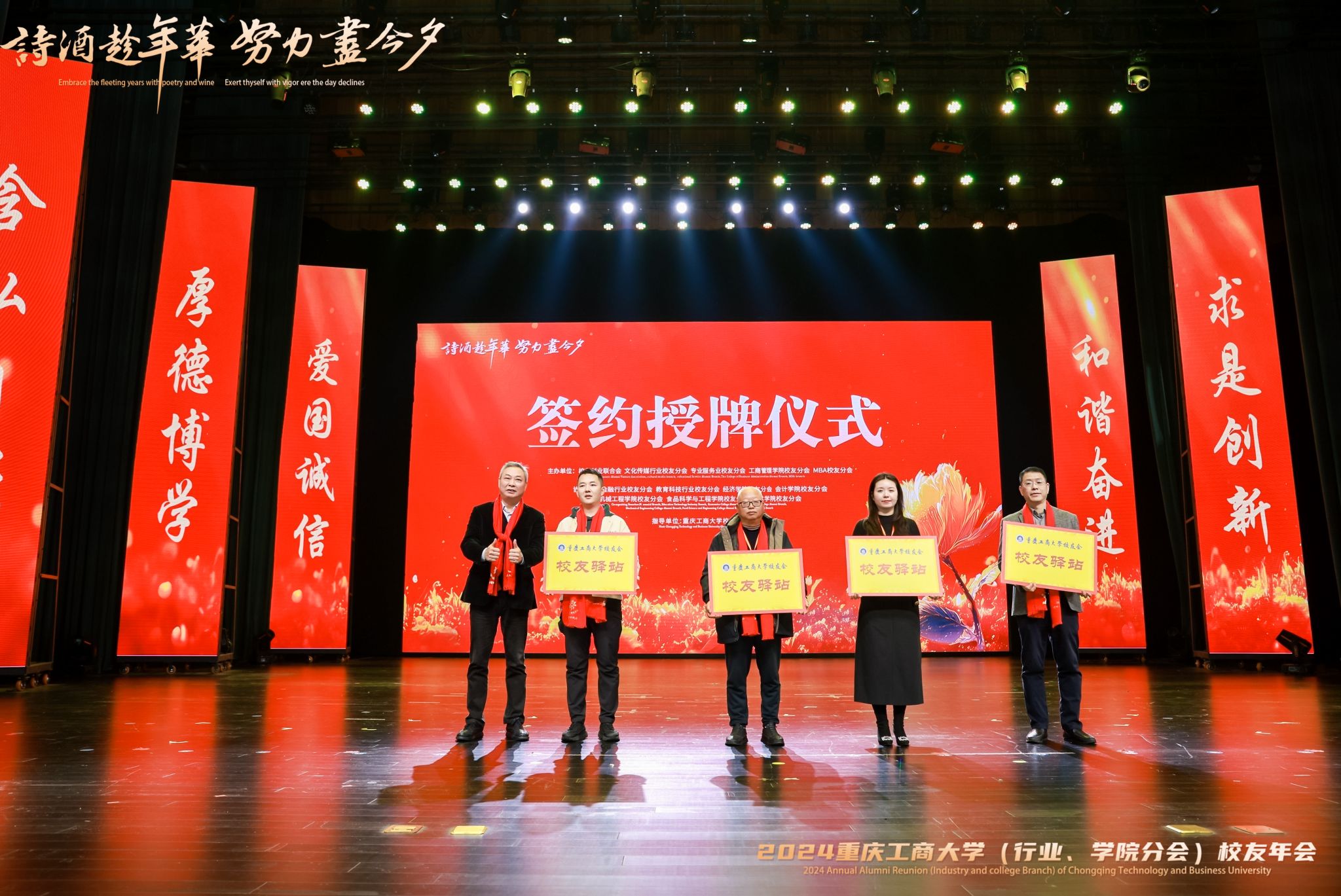 祥龙辞岁归玉宇,金蛇起舞启新程。12月28日,学校2024行业、学院分会校友年会在南岸校区图书馆剧场成功举行。重庆经开区党工委委员、管委会副主任舒勤科,学校党委书记曾维伦,党委常委、副校长李国军,党委常委、纪委书记、重庆市监委驻学校监察专员张海燕,党委常委、副校长任毅,党委常委、副校长杨柏,学校老领导王崇举应邀出席年会。南岸区科技局、重庆经开区投资集团(产业集团)副总经理、迎龙创新港·大学科技园以及学校相关部门和学院的负责同志,各兄弟院校校友会代表,学校校友总会和各分会的班子成员以及部分师生代表500余人,齐聚南山之麓、翠湖之滨,共赴校友年会“诗酒趁年华,努力尽今夕”之约。
