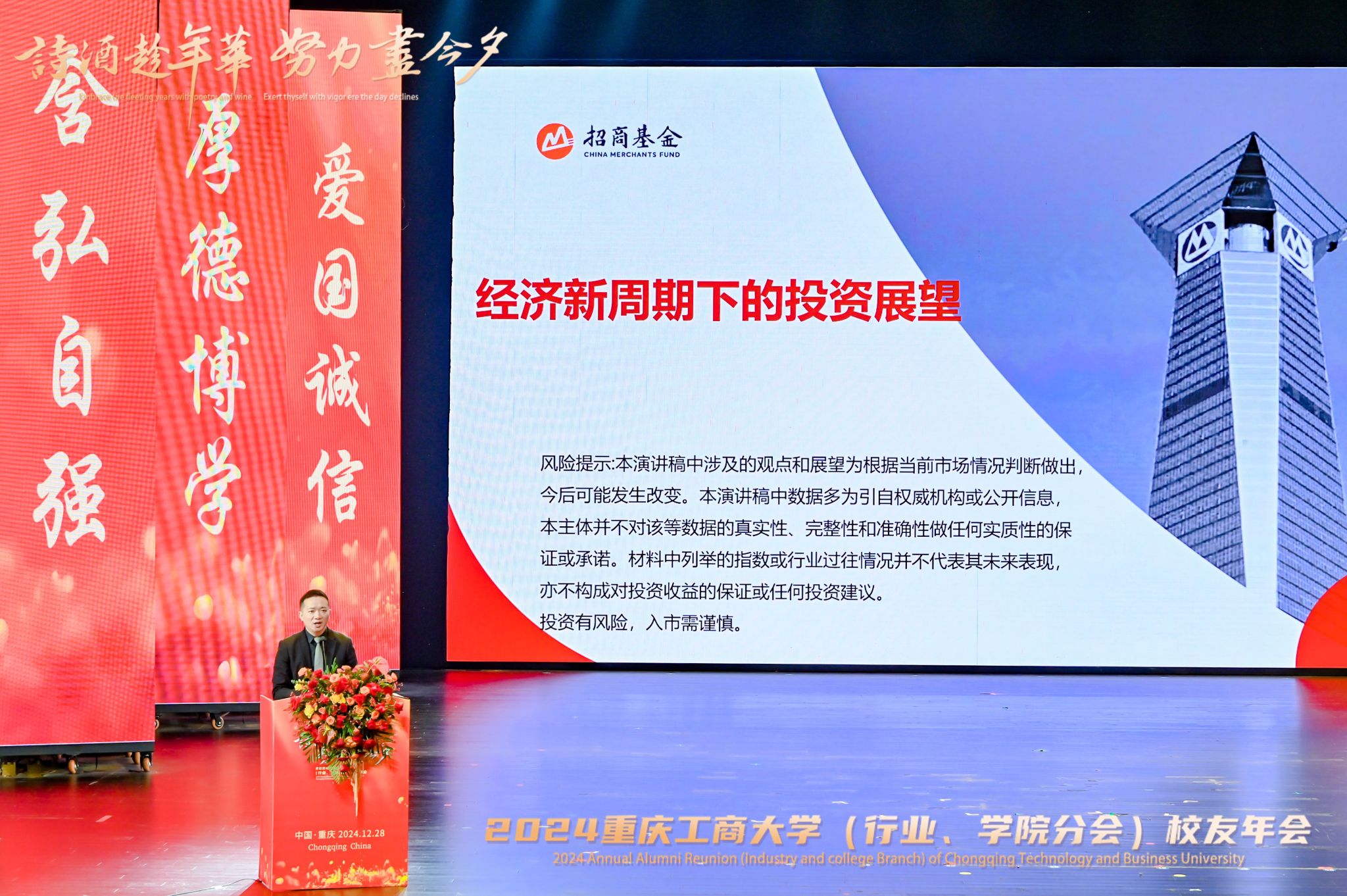 招商基金资深策略分析师汪洋,2014级MBA校友、中国石化重庆易捷分公司副总经理封丽,2001级法学校友、北京盈科(重庆)律师事务所党委书记崔建芳,2002级投资经济校友、重庆新骄阳健康产业股份有限公司董事长黄欢,1982级新闻校友葛伟分别以“经济新周期下的宏观展望”“向阳而生,保持持续创新的成长之路”“和合而生、砥砺前行”“与怪兽同行的创业”“永远向前看”为主题展开了分享。