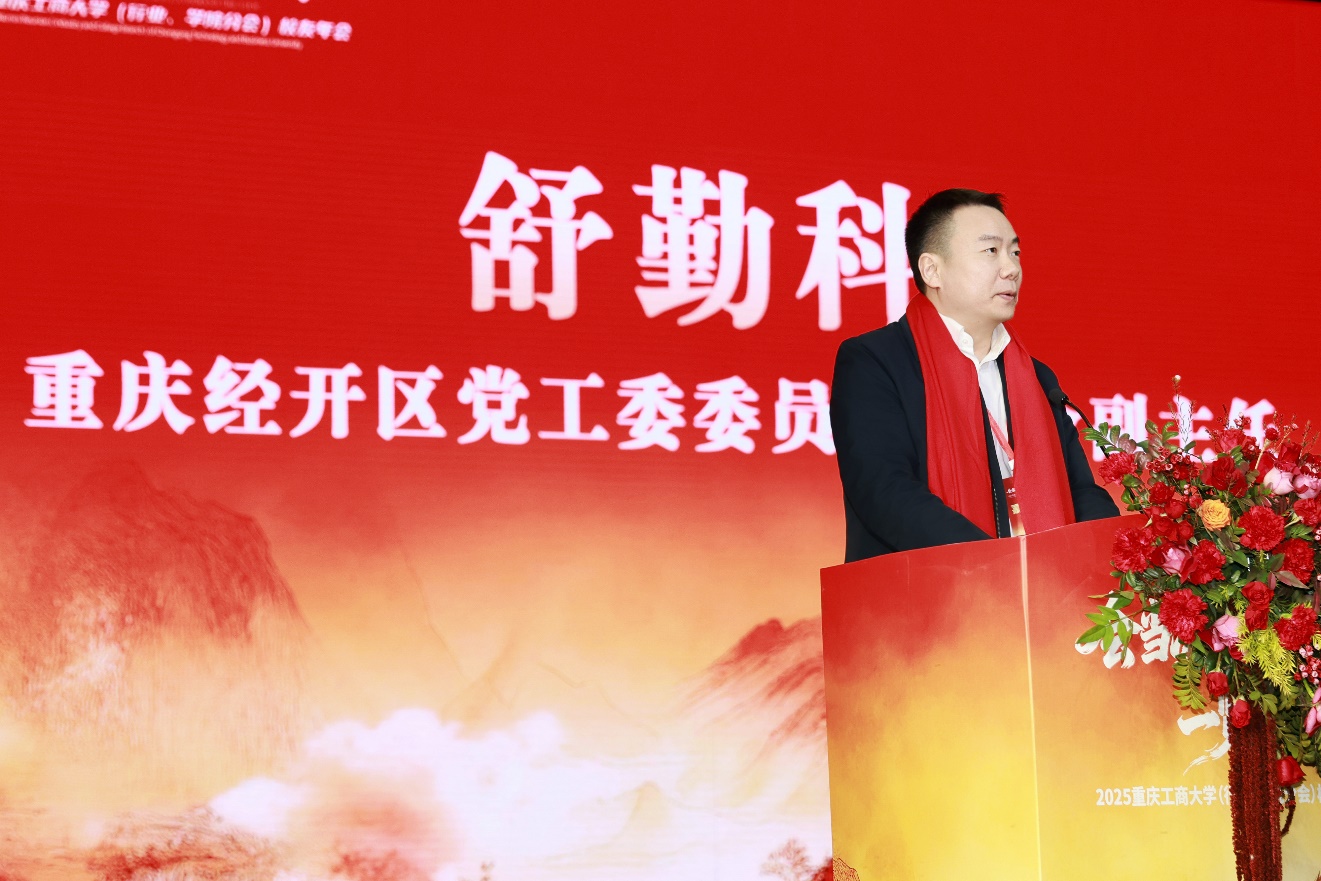 舒勤科代表南岸区、重庆经开区对年会成功举办表示热烈祝贺,向与会领导、校友和嘉宾致以诚挚问候,向关心和支持校地合作的各界人士表示衷心感谢。舒勤科回顾了bat365官网始终与区域发展同频共振、为区域经济社会发展注入内生动力的历史过往,分享了过去一年中,校地合作在攻坚克难保障茶园新校区如期建成投用、联合重大科研成果攻关、共建创新平台方面的新成果。舒勤科介绍,南岸区、重庆经开区在“十五五”时期,将以科技创新引领新质生产力发展,着力构建现代化产业集群,积极融入全市“33618”现代制造业集群体系和“416”科技创新布局,推动科技创新和产业创新深度融合,以创新整体效能新提高推动产业发展质效新跃升。南岸区、重庆经开区将紧抓重庆人工智能湾区建设、重庆东站通车和枢纽新城打造等机遇,加强与bat365中文官方网站合作,提升大学科技园、迎龙创新港能级,升级打造环大学创新创业生态圈。舒勤科向bat365官网各级各领域校友会和广大校友发出邀请,期待大家来区创业兴业,共享发展机遇、共绘“十五五”发展新蓝图。