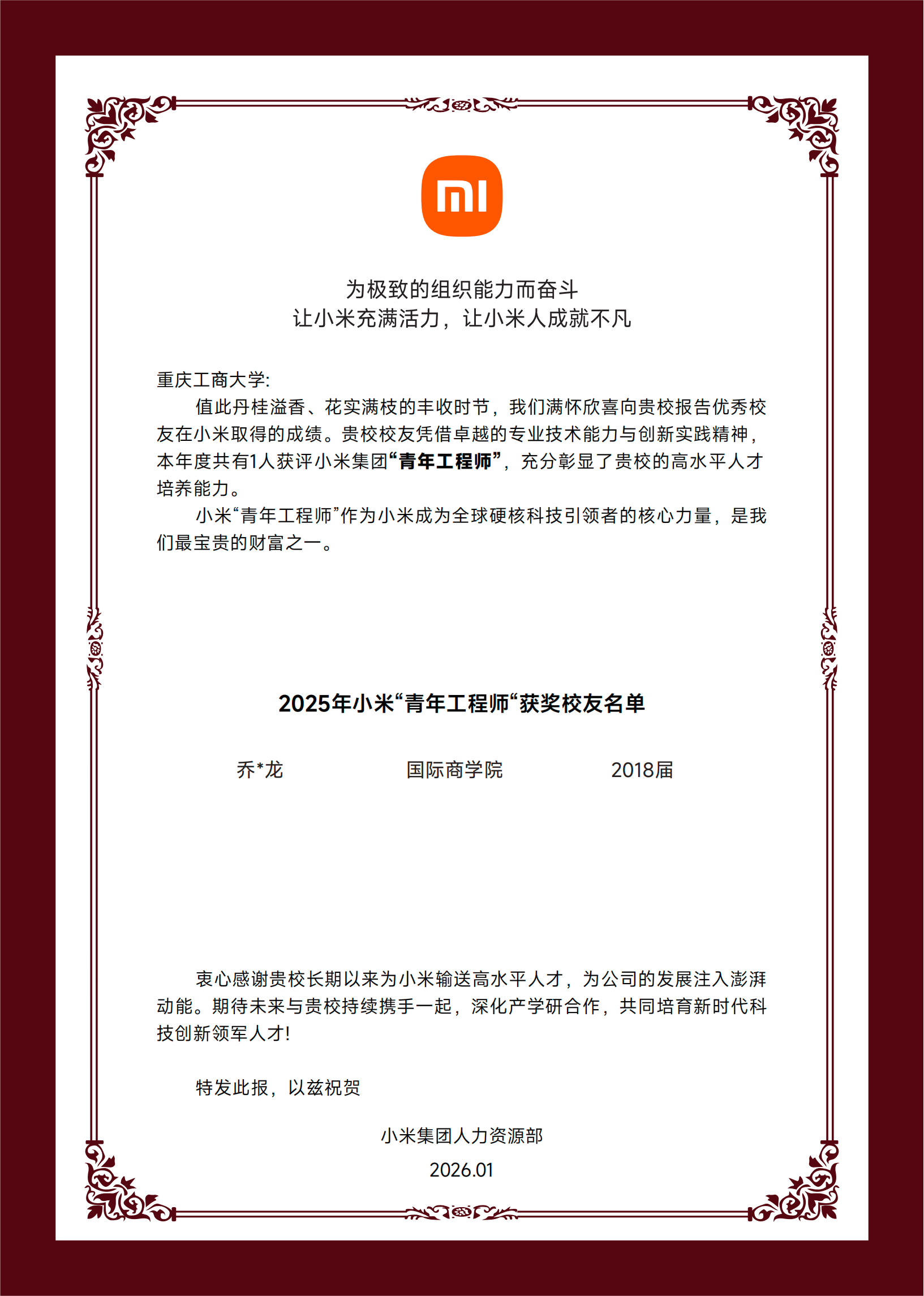 为感谢学校长期以来在人才培养方面的卓越成效,小米集团特向bat365官网发来喜报,对乔一龙校友的成长与成就给予充分肯定,也对学校持续向企业输送高质量人才表示高度认可。乔一龙校友的优异表现,不仅是个人努力的结果,也彰显了bat365官网育人理念与人才培养成效。